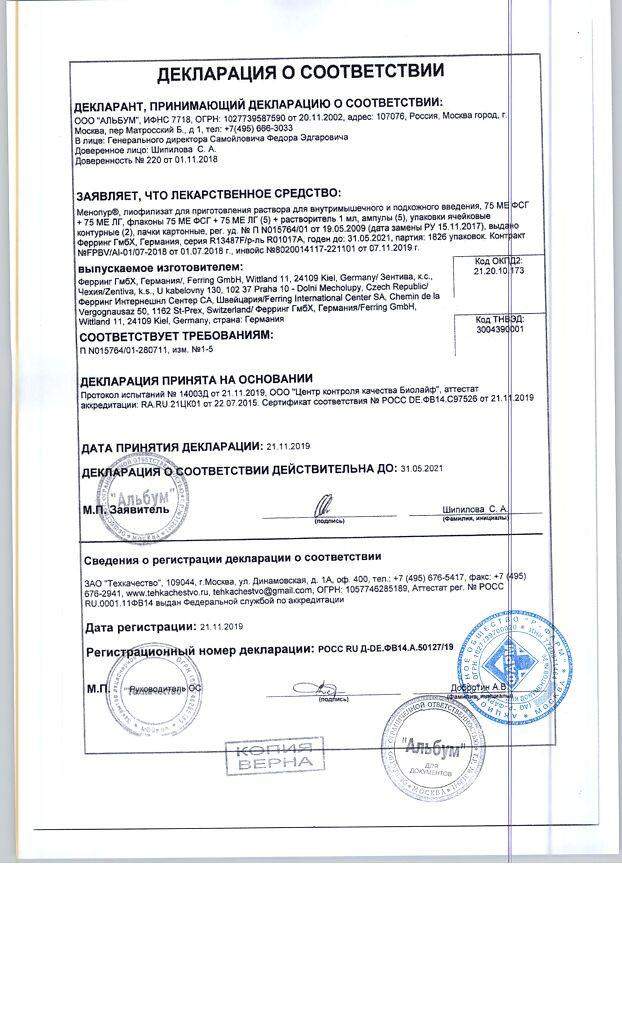 Менопур® является препаратом человеческого менопаузного гонадотропина (чМГ), высокой степени очистки. Относится к группе меноторопинов, содержит ФСГ и ЛГ в соотношении 1:1. Препарат получают из мочи женщин в постменопаузе.