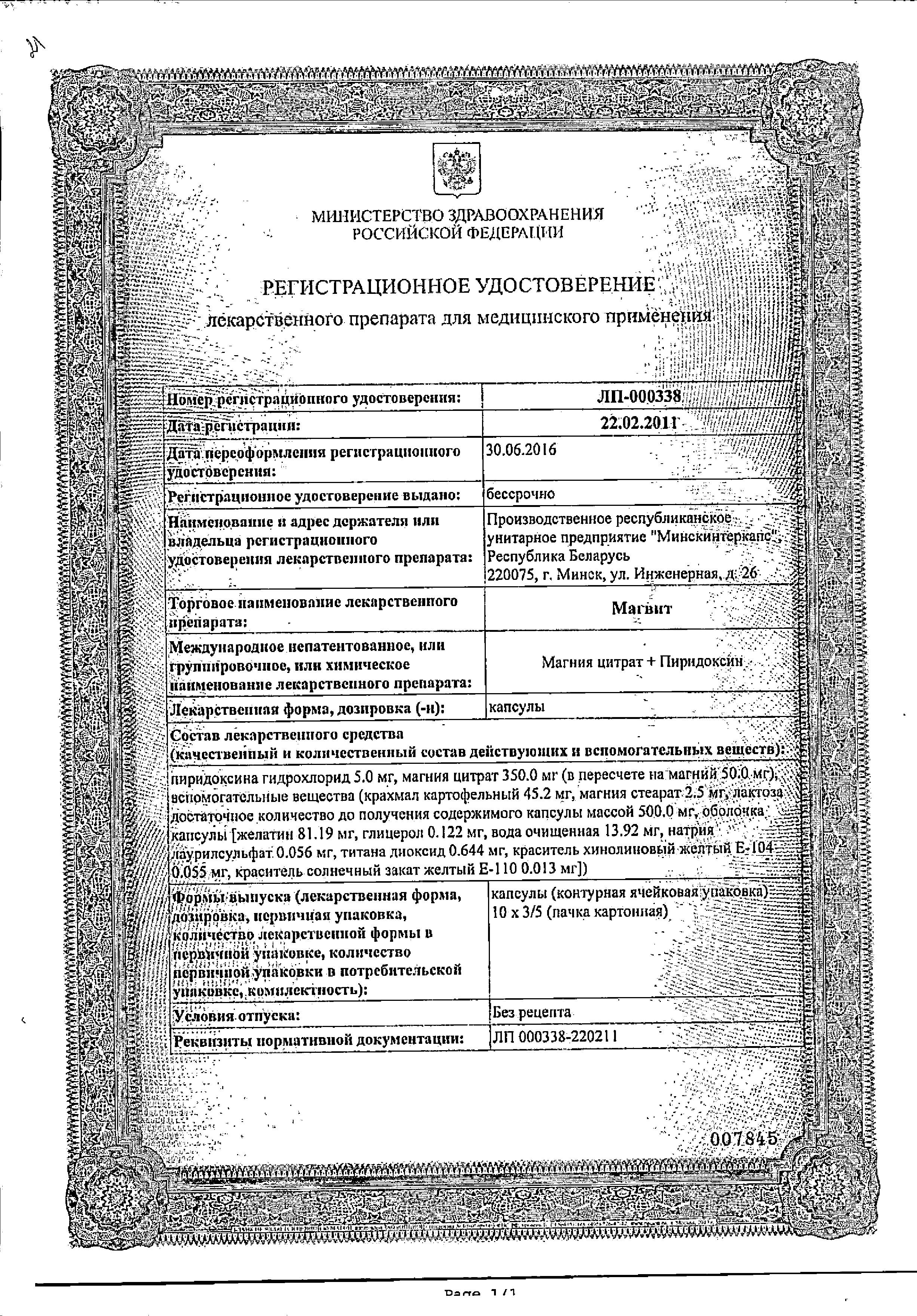 Противопоказания. Не рекомендуется применять при аллергии к какому-либо компоненту препарата, а также в случае тяжелой почечной недостаточности, гипермагниемии, гипервитаминоза B6, атриовентрикулярной блокады, миастении, паркинсонизма, тяжелой гипотензии, а также желудочно-кишечной мальабсорбции и диареи.