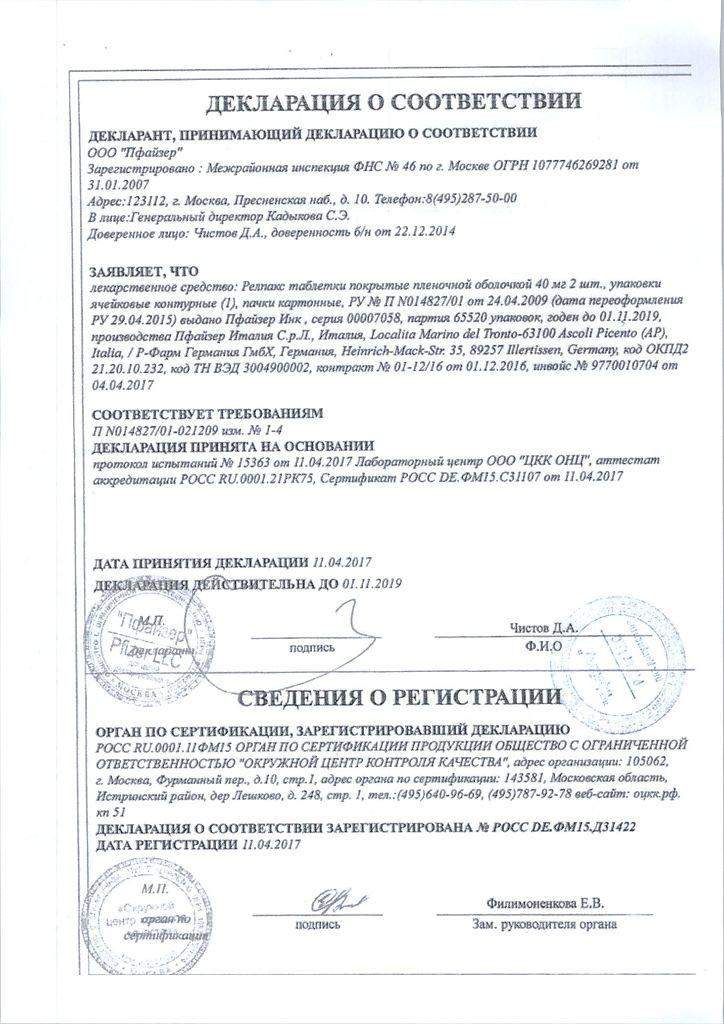 Прием кофеина/эрготамина внутрь через 1 и 2 ч после приема препарата Релпакс приводит к небольшому, но аддитивному повышению АД, которое можно было предсказать на основании фармакологических свойств этих препаратов. В связи с этим препараты, содержащие эрготамин, или производные эрготамина (в т.ч. дигидроэрготамин) не следует назначать в течение 24 ч после приема препарата Релпакс.
