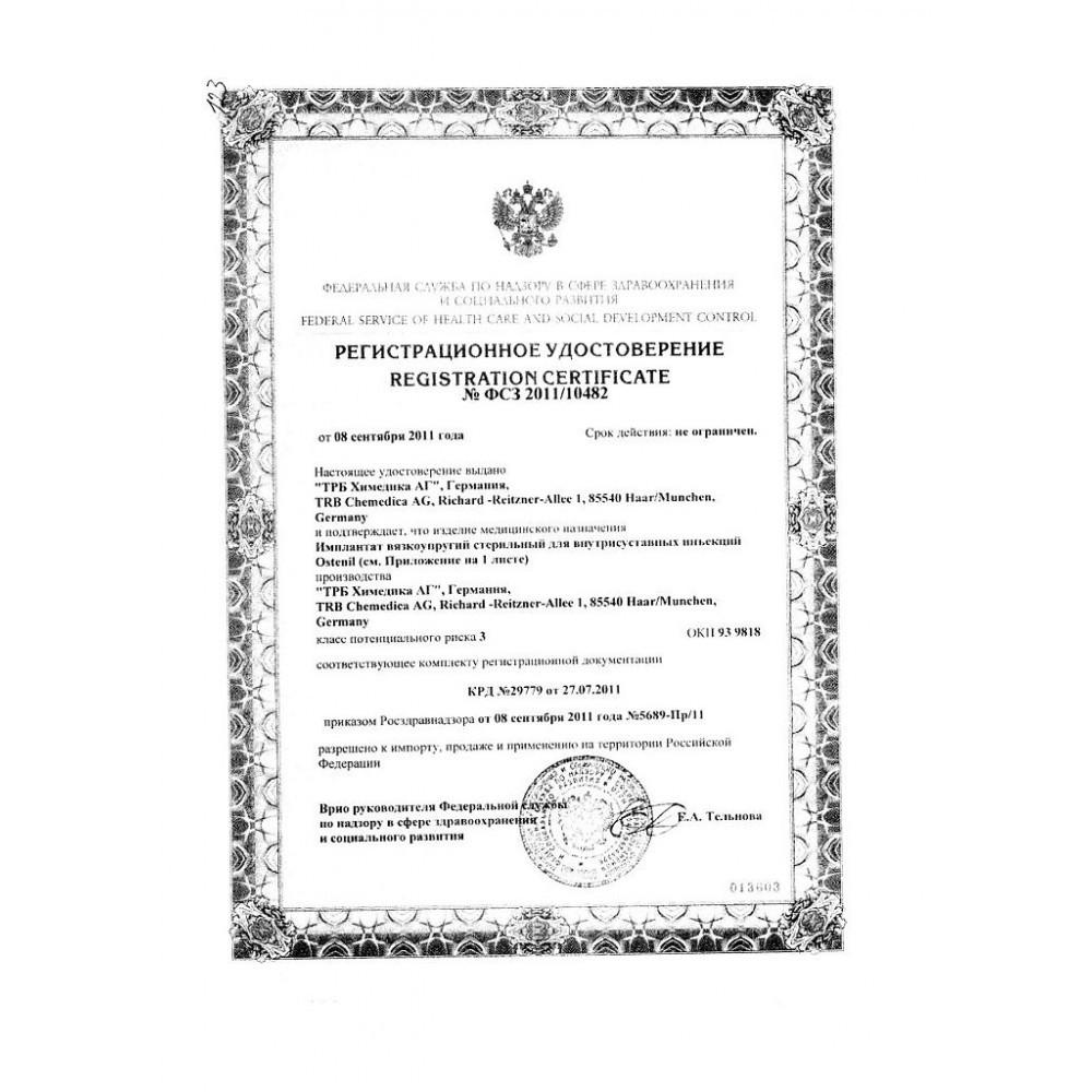 Вводить Остенил в пораженный сустав один раз в неделю в течение 3-5 недель. Одновременно можно лечить несколько суставов. В зависимости от степени заболевания положительный эффект курса лечения из 5 внутрисуставных инъекций обычно продолжается не менее 6 месяцев. При необходимости могут назначаться повторные курсы. В случае наличия выпота в сустав до лечения Остенилом рекомендуется провести эвакуацию выпота, обеспечить покой, применение льда и/или внутрисуставную инъекцию кортикостероидного препарата. Лечение Остенилом можно начинать через 2-3 дня после процедуры.Содержимое и внешняя поверхность заранее заполненного шприца Остенила сохраняют стерильность до тех пор, пока не будет разорван пакет. Выньте заранее заполненный шприц из упаковки, снимите колпачок Luer со шприца, наденьте нужную канюлю (например, 19 или 21 Г) и закрепите ее, слегка повернув. Перед инъекцией выпустите пузырьки воздуха из шприца.