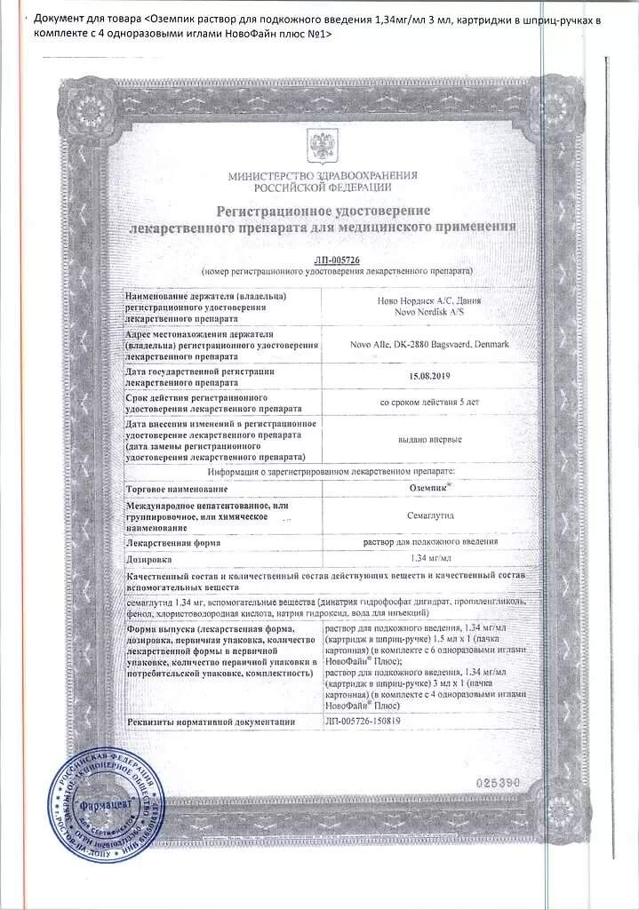 Фото Оземпик раствор для инъекций 1,34 мг/мл шприц-ручка 3 мл + иглы 4 шт. (1мг/доза 4 дозы)