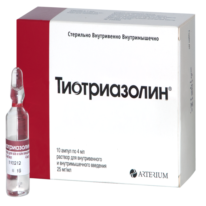 Применение. Раствор Тиотриазолин 2.5% вводится внутримышечно или внутривенно. При остром инфаркте миокарда и хроническом активном гепатите назначают введение 50 мг тиотриазолина внутримышечно 2-3 раза в день или 100 мг тиотриазолина внутривенно или капельно 1 раз в день. При стенокардии напряжения и покоя, а также постинфарктном кардиосклерозе и гепатите умеренной степени активности назначают введение 20 мг тиотриазолина внутримышечно трижды в день.