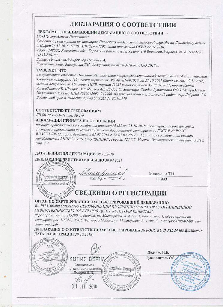 Брилинта® содержит тикагрелор, представитель химического класса циклопентилтриазолопиримидинов, который является селективным и обратимым антагонистом Р2Y12-рецепторов прямого действия и предотвращает АДФ-опосредованную Р2Y12-зависимую активацию и агрегацию тромбоцитов. Тикагрелор не предотвращает связывание АДФ, но его взаимодействие с Р2Y12-рецептором тромбоцитов предотвращает АДФ-индуцированную трансдукцию сигналов. Т.к. тромбоциты участвуют в инициировании и/или развитии тромботических осложнений атеросклероза, было показано, что ингибирование функции тромбоцитов уменьшает риск развития сердечно-сосудистых явлений, таких как летальный исход, инфаркт миокарда или инсульт.