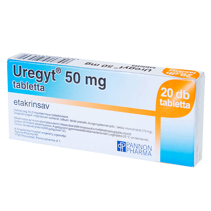 Таблетки Урегит белые, без посторонних включений, с разделительной фаской на одной из сторон. В картонной коробке 2 пластиковых блистера с 10 таблетками. Активной составляющей Урегита является этакриновая кислота в дозе 50 мг. Остальные компоненты представляют собой вспомогательные вещества и элементы оболочки, включающие: