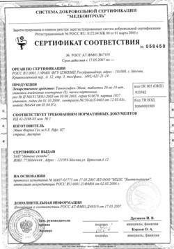 Состав оболочки: краситель белый опадрай - 5 мг (лактоза - 1.8 мг, титана диоксид - 1.3 мг, гипромеллоза - 1.4 мг, полиэтиленгликоль 4000 - 0.5 мг).