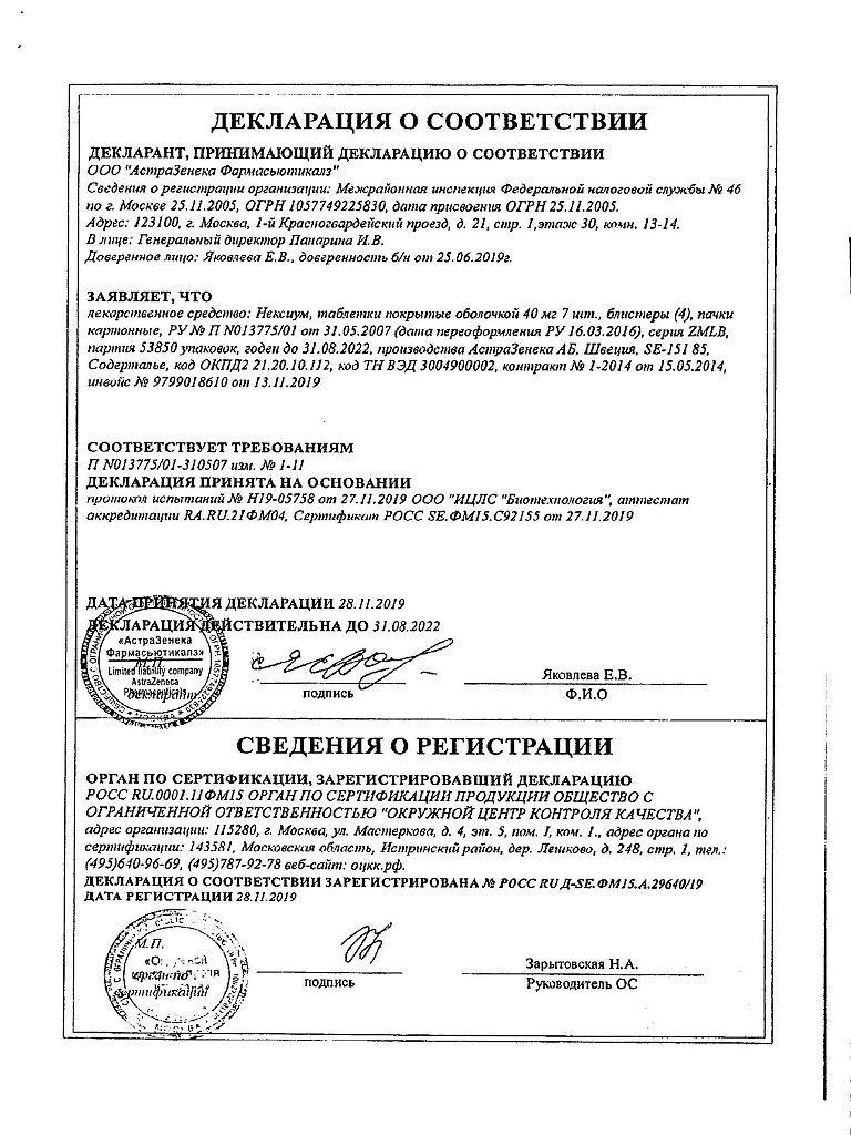 1 таблетка Нексиум 40 мг содержит: активное вещество: 44,50 мг эзомепразола магния тригидрата, что соответствует 40 мг эзомепразола.Показания к применению